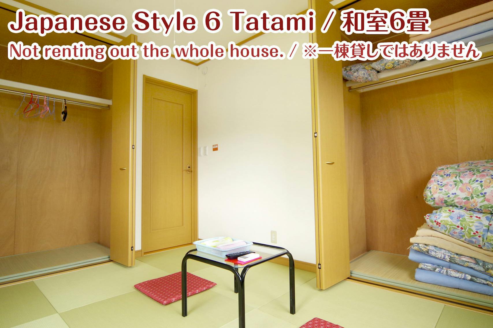 お部屋をリニューアルしました! [和室6畳-B]は東南向きで、日当たりの良いお部屋です。またクローゼットは二箇所あり、多くの荷物を収納することができます。 お部屋は全てエアコン付き個室の和室となります。 ベッドはありません。すべて布団になります。 お部屋には無料のWiFiを完備しております。 ※和室6畳のお部屋タイプのご予約で、寝具なしのお子様のご宿泊は、スペースの関係上2名様までとさせて頂いております。