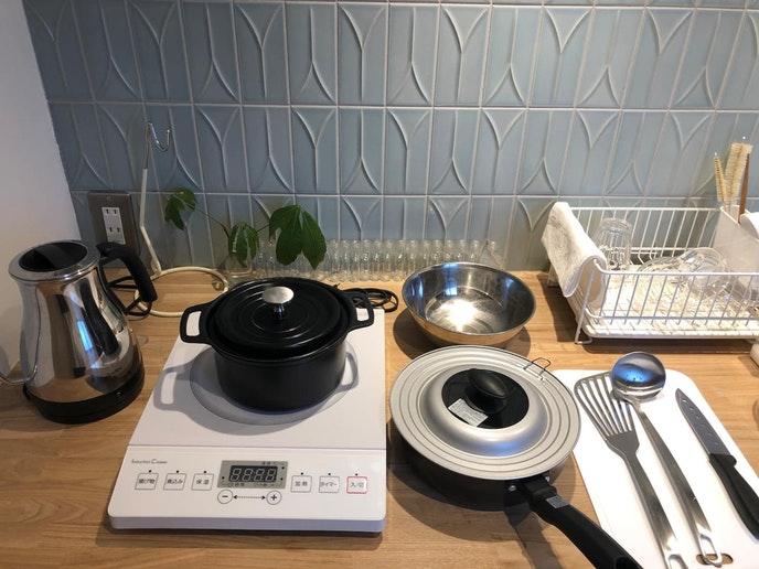4組のお布団が敷けるオシャレな和室とキッチンスペース。洗面所、シャワーブースが付いています。 【設備】 電子レンジ、冷蔵庫、ポット、IHひと口コンロ、食器、カトラリー 、調理器具、調味料、シャワー、Wi-Fi、充電器、ドライヤー、暖房(扇風機)、加湿器、ハンガーラック、タオルハンガー、ランドリーボックス、絆創膏、マスク、ボード・カードゲーム、ハサミ、爪切り他 【アメニティ】 寝具(敷布団、掛布団、枕、シーツ2枚、枕カバー1枚)、化粧水、乳液、美容液、メイク落とし、コットン、綿棒、ヘアゴム、シャンプー、トリートメント、ボディシャンプー、フェイスタオル1枚、バスタオル1枚、歯ブラシ(歯磨き粉)、ブラシ 【お部屋の飾りつけ・サプライズ演出サービス】 ご希望のお客様には、お誕生日やイベントのデコレーションを承ります(1500円~)。ケーキや飾りつけ、音楽などサプライズ演出をご希望の場合はご相談ください♪