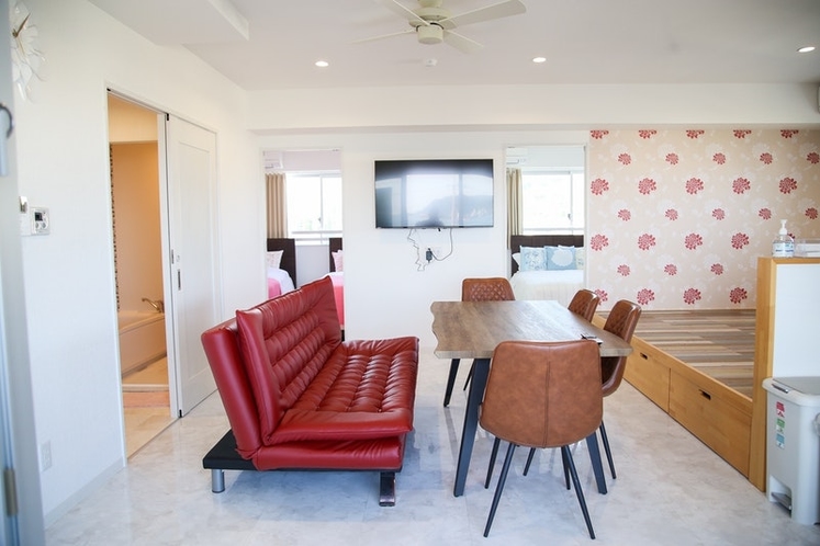 女の子が喜ぶ様な可愛いらしい赤をモチーフにインテリアしたお部屋です。 女子会やちょっとしたパーティーも楽しめる雰囲気でベランダからは綺麗な海が眺められるお部屋です。 このお部屋は、ペットも一緒に泊まれます。 (ペットの同伴料はいただきません。) 那覇空港からの送迎可能です。(要TEL) ご利用の方は、ご相談下さい。