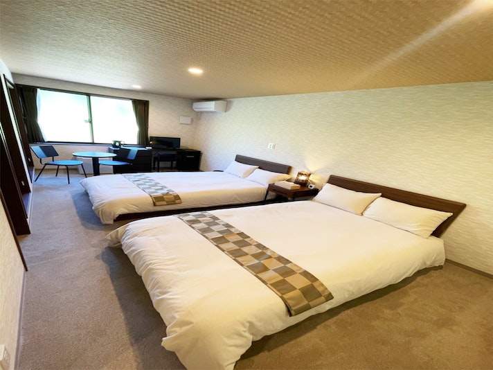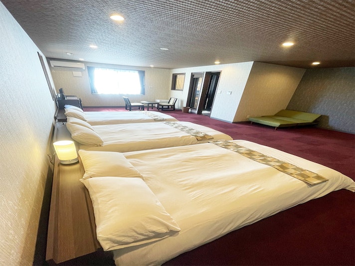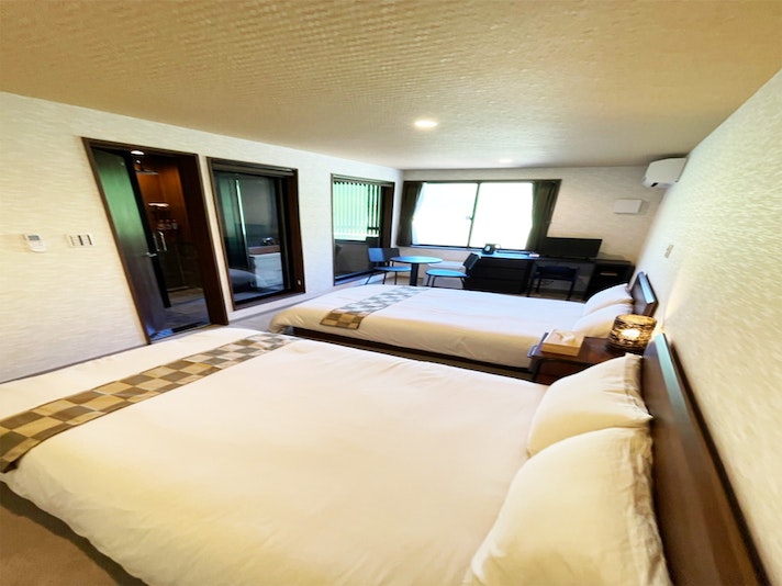 ベッドは全てセミダブルベッド(幅124CM)を使用し、全室ヒノキ露天風呂付のお部屋は、日本を感じられる空間となっており、癒しと安らぎをご提供いたします。 外国からのお客様には非日常の和空間をお楽しみ頂き、旅の疲れを癒して日本滞在の良い思い出の一つとして頂けると思います。 1ベッド2名様にてご使用頂きますのでご宿泊される人数によりベッド数は異なります。
